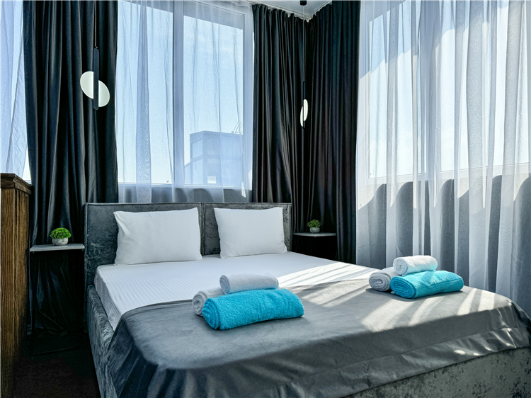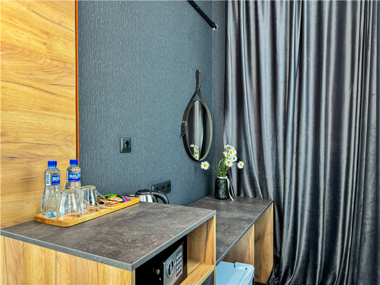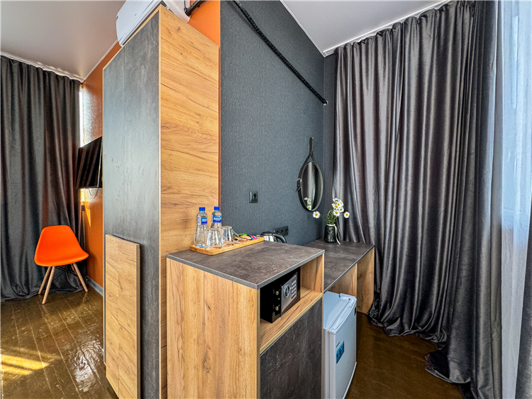 2 осн. места. 2 доп. места. В номере: 1 двуспальная кровать 160*200, прикроватные столики, шкаф-гардероб, консоль, стул, пуф, 2 зеркала, телевизор, сейф, чайная станция, душ, туалет, ванные и косметические принадлежности, халаты, тапочки, фен, мини холодильник, кондиционер, сушилка для белья, Wi-Fi. Максимальное размещение: до 4 гостей. Доп.место - диван-кровать.